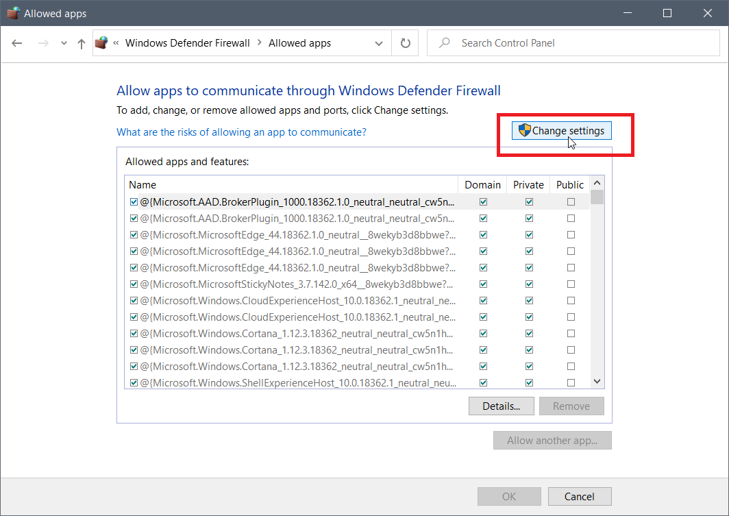 4,From the displayed Allowed apps dialog box, click the [Change settings] button.